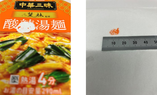 商品のフタの上に、調味オイルやスパイスなどの別添の小袋を樹脂で接着させていますが、その樹脂が剥がれ、調理の際に誤って混入することがあります。厚さは約1㎜ほどで、フタの印刷模様が付着している場合が多くあります。
